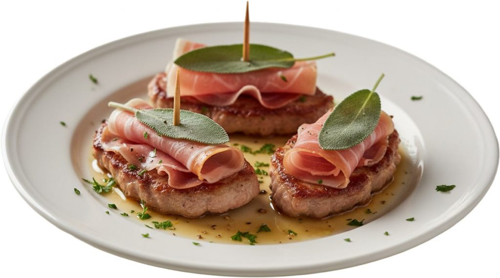 Recept: tanke šnicle od teletine sa pršutom i žalfijom, kratko propržiti, preliti belim vinom i ostaviti da se sos redukuje.